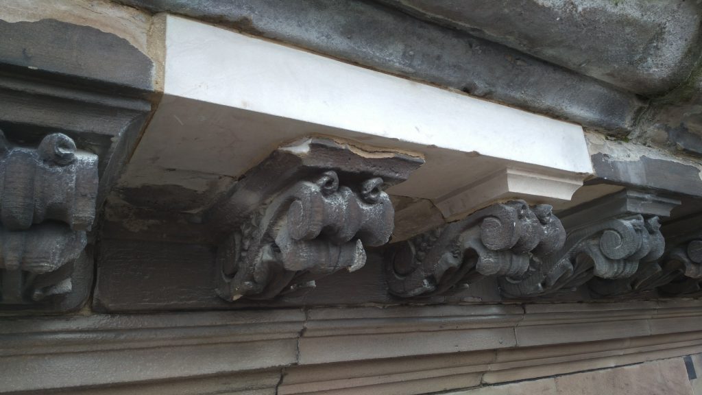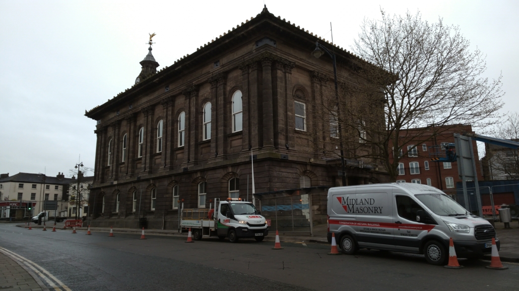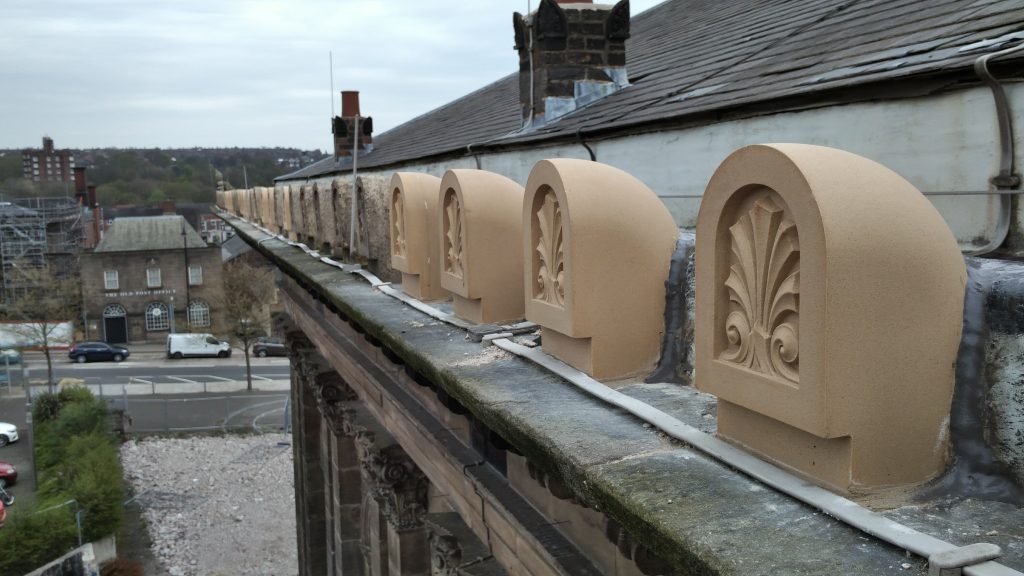 High level repairs were needed to replace terracotta features around the roofline of this grade2* listed former town hall. Existing units were failing and analysis showed that they were poorly formed and fired. New units were produced by Darwen Terracotta and installed with specialist access and traffice management in this town centre location.