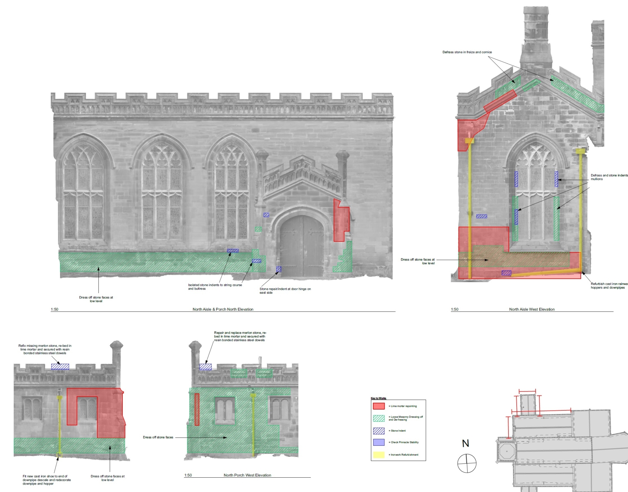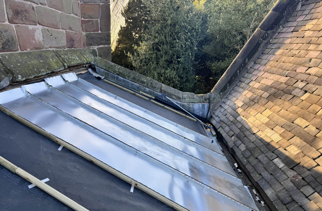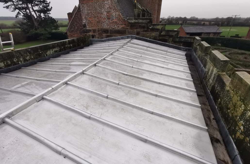 Repairs and re-roofing to a Grade 1 listed Elizabethan moated manor house following theft of lead. Terne-coated stainless steel was used for the new roof covering.